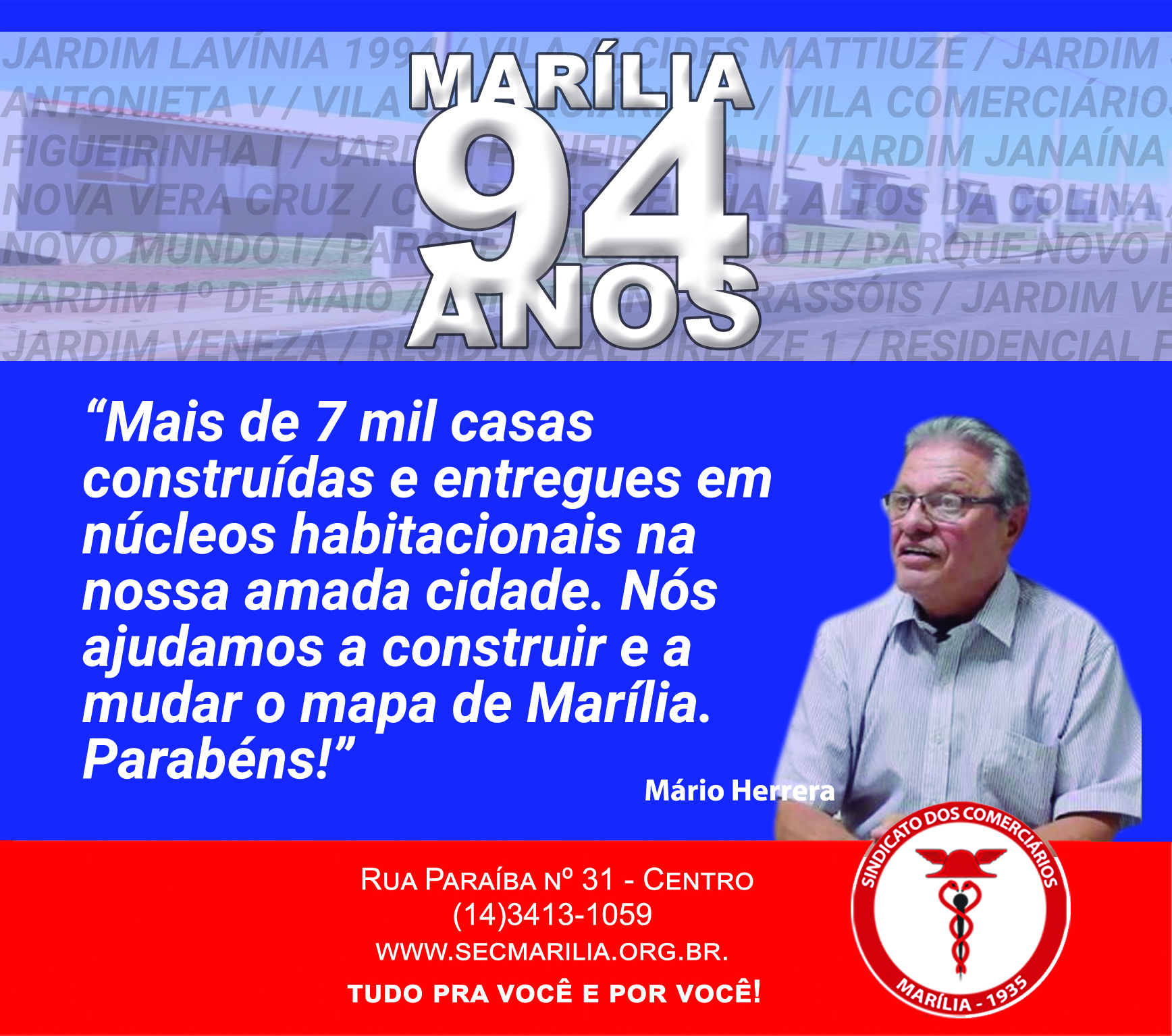 Nesses 94 anos comemorados por Marília neste dia 4 de abril, o Sindicato dos Empregados de Marília colaborou muito com o desenvolvimento do município, através dos seus trabalhadores comerciários e do projeto habitacional da entidade.